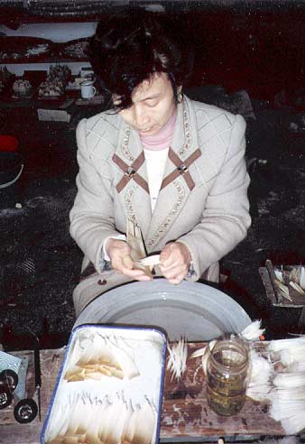 Die verschiedenen Haare werden sortiert, gewaschen und nochmal sortiert und dann aus der Wasserschüssel heraus aufgenommen und auf einer Art Knochenkamm gelegt , eingeteilt, geschnitten und zum Pinselkopf geformt. Diese Arbeit erfordert Geschicklichkeit und viel Wissen über die unterschiedlichen Pinsel.