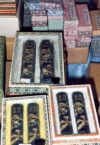 Schon sehr früh erlangte die Tusche eine geradezu kultische Bedeutung als das wichtigste Material der Schreibkunst. Sie wurden dementsprechend mit Darstellungen aus Legenden oder mit magischen Schriftzeichen verziert. Die Inschrift zeigt außerdem das Firmenzeichen, den Namen des Herstellers und das Datum. Besonders in der Song-Zeit (960-1279) wurden sie von Literaten als Sammelobjekte geschätzt, gehortet und vererbt.